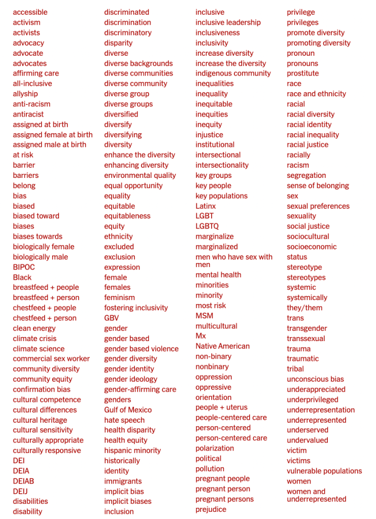 Gira online questa lista di parole che l’amministrazione Trump avrebbe “proibito” e che includono “donne”, “ingiustizia”, “politico” e tante altre. Non si tratta ovviamente di divieto esplicito. E però non siamo lontani da un assurdo orwelliano, come la cancellazione delle fotografie dell’Enola Gay al dipartimento della Difesa ben evidenzia. La lista sta in numerose linee guida inviata ad agenzie e dipartimenti federali invitati a rimuovere materiali che le contengono o a verificarli, prestandovi particolare attenzione e, nel caso, “cancellarli”. Costituisce insomma una sorta di warning. Da quel che sappiamo vi sarebbe una certa discrezionalità nell’applicazione di queste indicazioni, con alcuni dipartimenti più zelanti e altri meno. Sembra altresì che uno dei principali target siano i finanziamenti federali alla ricerca, che per avere oggi qualche possibilità di essere stanziati non devono contenere questi termini.